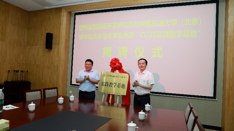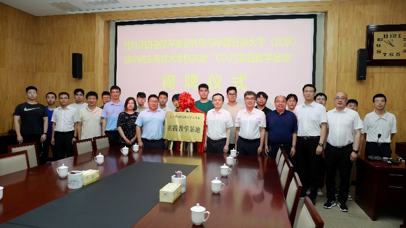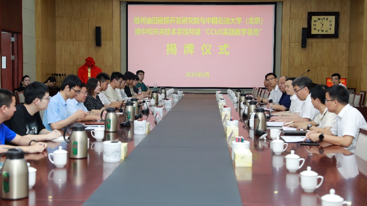 2024年6月27日,beat365唯一官方网站(北京)碳中和未来技术学院与胜利油田勘探开发研究院共建的“CCUS(碳捕集、利用与封存)实践教学基地”揭牌仪式在胜利油田勘探院举行,胜利油田勘探开发研究院院长、党委副书记张世明,副院长、党委常委翟亮,油田高级专家张传宝,院首席专家兼科研计划部经理肖武,院首席专家季岩峰,院副总师兼人力资源(组织)部经理王长轩,气驱试验室经理李宗阳,beat365唯一官方网站(北京)碳中和未来技术学院副院长芮振华,院长助理杨磊磊,教师代表赵阳参加了揭牌仪式,活动由胜利油田勘探院副院长翟亮主持。