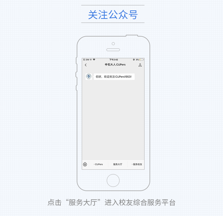 第一步:关注“beat365人CUPers”公众号,点击“服务大厅”进入校友会综合服务平台。