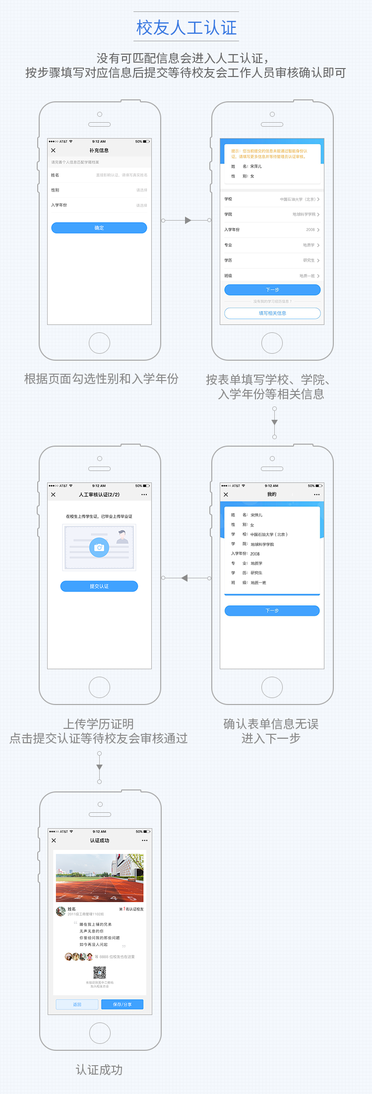 第三步:当注册使用的手机号、校友姓名与智能库匹配时,则自动匹配通过认证,参与校友平台互动。