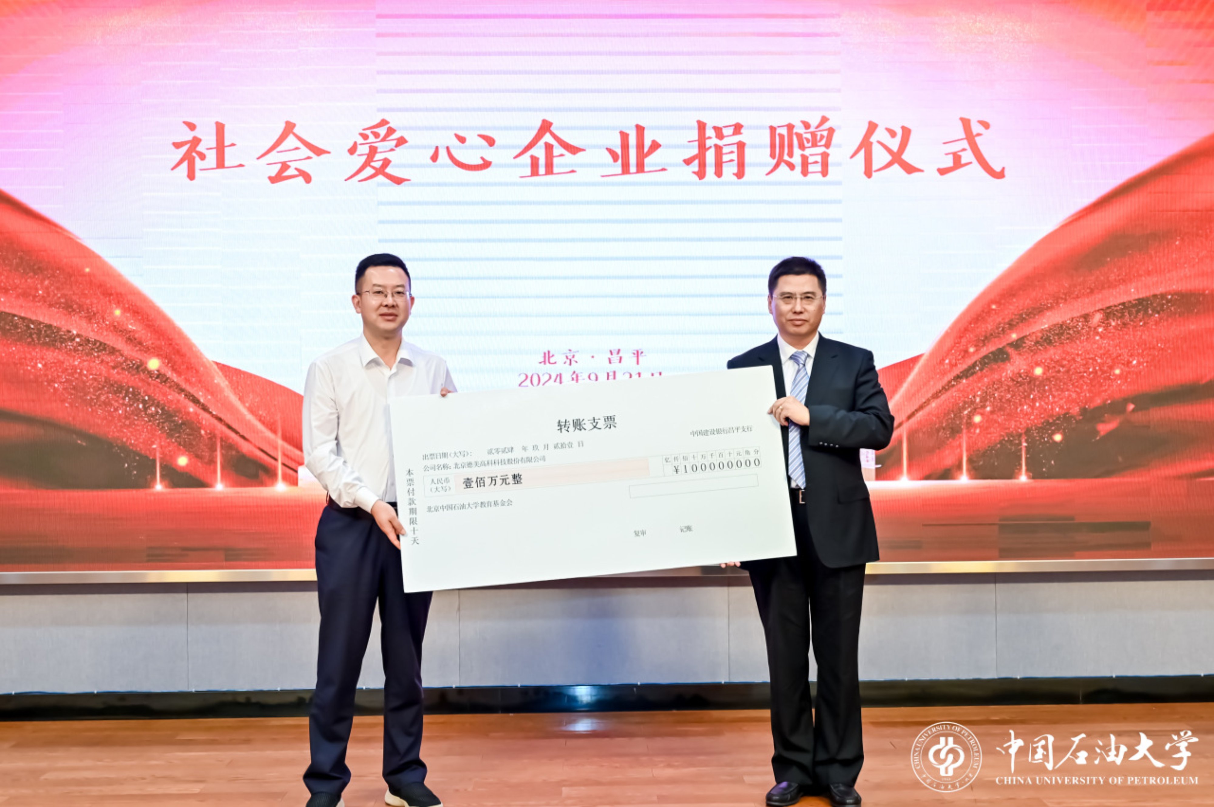 会上,北京德美高科科技股份有限公司董事长张德斌、山东祺龙海洋石油钢管股份有限公司总经理孟庆滨分别代表两家爱心企业,为学校捐赠100万元、50万元。文永红代表北京beat365唯一官方网站教育基金会接受捐赠并颁发捐赠证书。