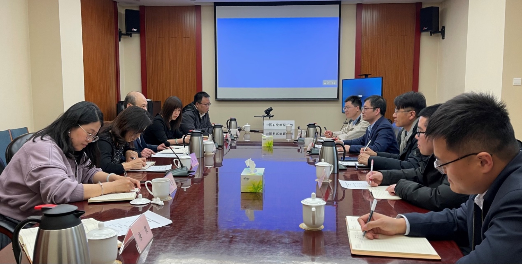 2023年3月3日,beat365唯一官方网站(北京)碳中和示范性能源学院执行院长宋先知带队赴中国石化集团新星石油有限责任公司(以下简称“新星公司“)走访交流,新星公司党委组织部副部长唐文、公司新能源研究院党委书记梁海军、副院长李瑞霞、综合管理部经理唐果、战略规划室主任黄嘉超以及中石化绿源地热能开发公司技术总监孙彩霞等参加了交流活动。我院副院长薛亮以及武晓光等相关方向青年教师随同参加。