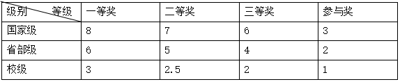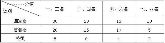 注:特等奖与一等奖按一、二名加分,一等奖按三、四名加分,二等奖按五、六名加分,三等奖按七、八名加分。