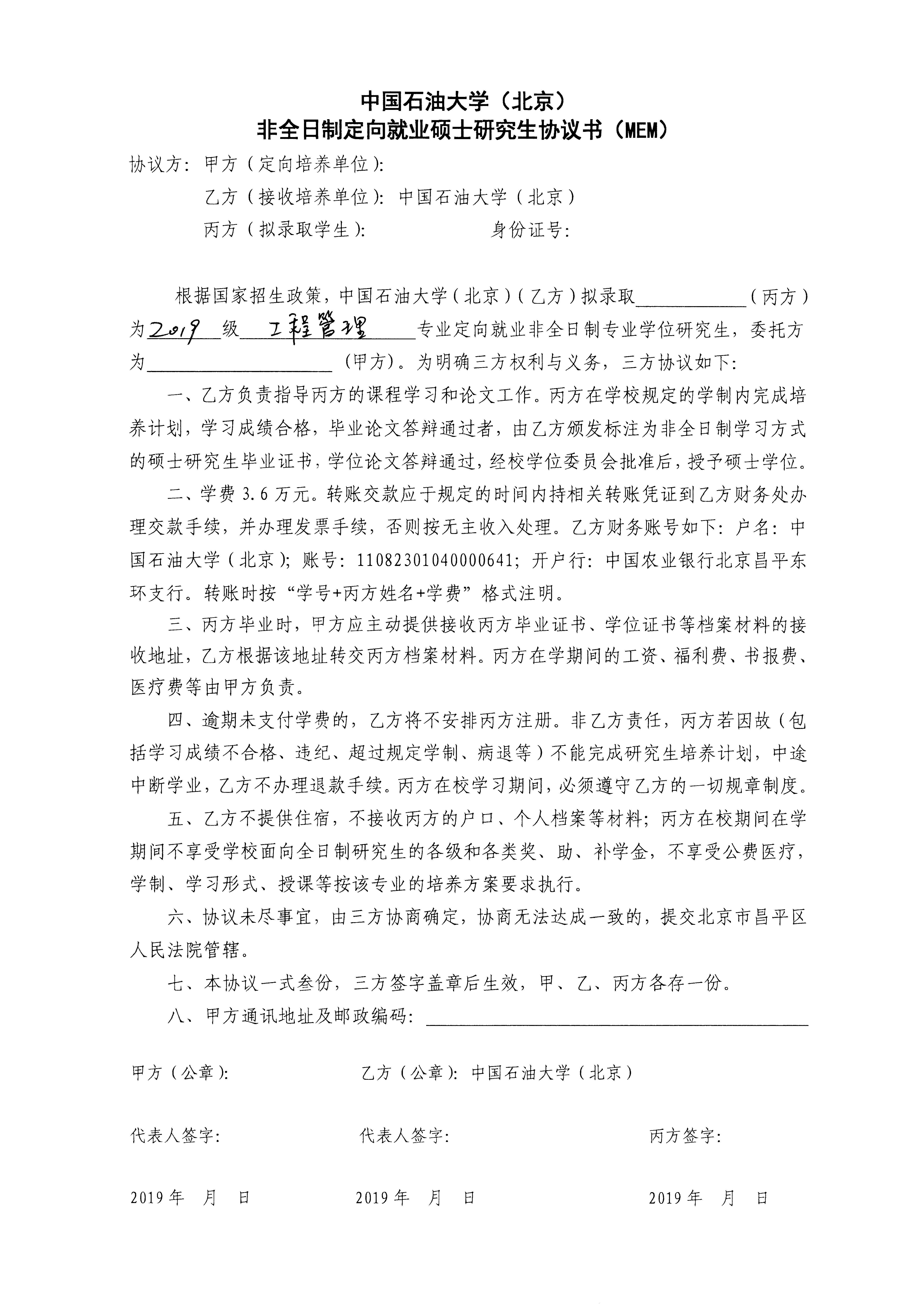 请收到手机短信的同学,下载附件2019年零散MEM协议后,打印一式三份。单位盖章(可以是法人公章或人力资源部门章),本人签字后于5月1日前寄回给谭华平。