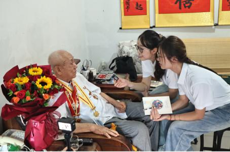 实践团走访慰问多名老兵,向为民族解放事业立下不朽功勋的老兵致以崇高敬意和深切关怀。98岁新四军老兵王云祥追忆战场救治伤员的过往经历,动情讲述晚年仍为社会捐款的党员担当;95岁枣庄武工队队员陈贵茂紧握成员双手,眼中含泪嘱托:“你们一定要努力报效祖国!”