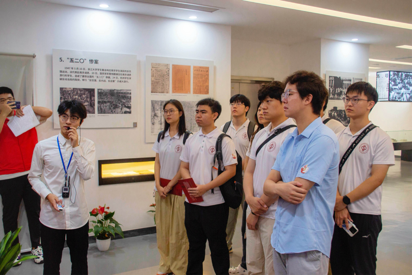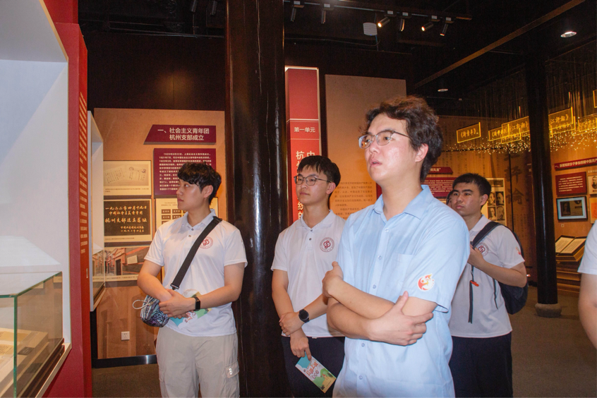 26日上午,实践团来到杭州青年运动史馆,追忆百年来杭州青年运动的峥嵘岁月和不朽事迹。馆内按照历史脉络分为“杭州青年为建立新中国而斗争”“杭州青年积极参与社会主义建设”“杭州青年在建设中国特色社会主义中建功立业”三个单元,通过文物资料、历史照片、微缩浮雕、多媒体展示等多种形式,全面、客观地展示了百年来杭州青年在中国革命、建设和改革开放各个历史时期不懈奋斗的历史经验。实践团成员们在讲解员的带领下,在照片、信件、遗物等各种文物中徜徉,成员们频频驻足,对文物背后的历史故事进行了详细的了解与记录,并和老师展开了深入交流与探讨。在声援五四运动、掀起“一师风潮”、建立中国社会主义青年团杭州支部、投身抗日洪流、抗美援朝、开展土地革命等等青年运动中,大家深刻体悟到革命时期进步青年们不畏强权、追求真理的爱国精神,深刻感受到社会主义建设时期青年们不怕吃苦、积极参与新中国建设的爱国热情。无数青年把青春的足迹镌刻在杭州解放与建设的征程中,谱写出了一曲曲雄浑激昂的青春之歌。