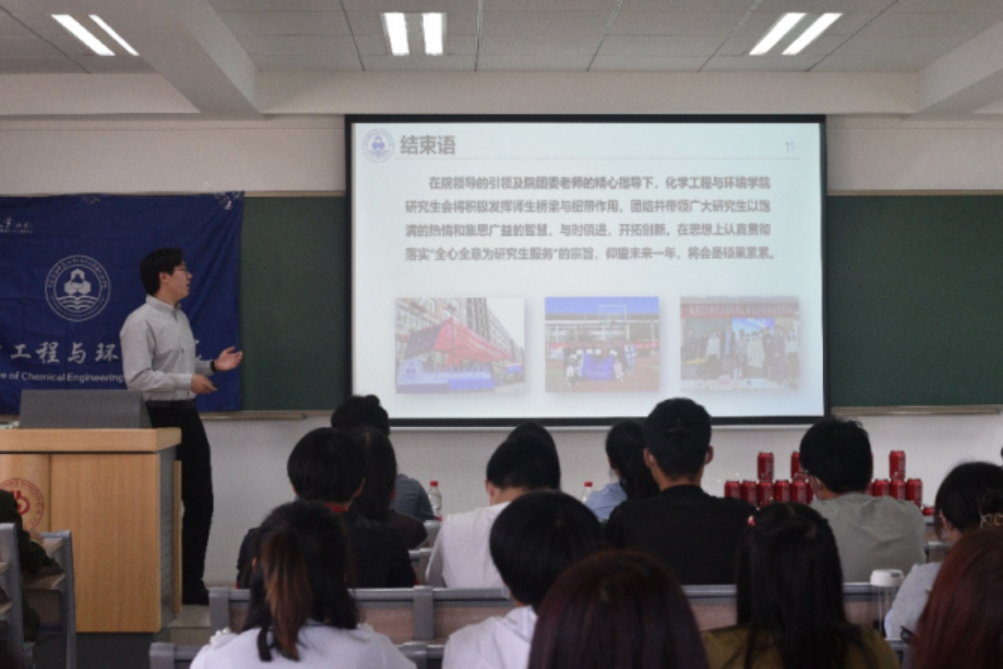 9月23日下午,在东教512举行化工学院第二十三届研究生成立大会,化学工程与环境学院团委书记韩瑾老师,化学工程与环境学院研究生会指导老师梁硕老师,第二十三届研究生会主席团成员杨同、刘尚书、沈红茹以及全体部委成员参加大会。