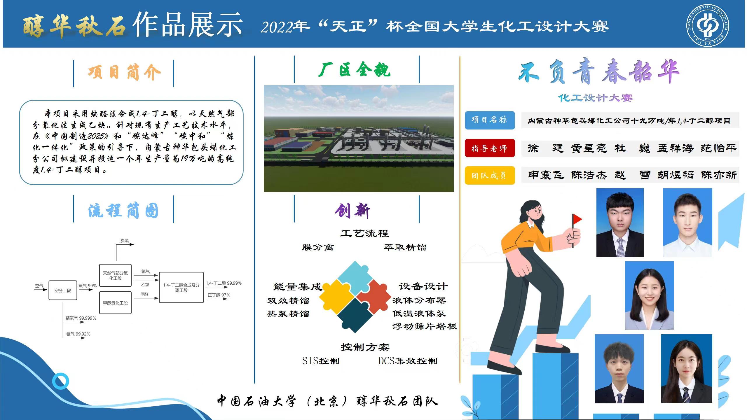 8月22日,“天正设计杯”第十六届全国大学生化工设计竞赛落幕。beat365唯一官方网站(北京)化学工程与环境学院申寒飞、陈浩杰、赵雪、胡煜韬、陈奕新五位学子组成的“醇华秋石”团队获大赛全国一等奖。指导教师为化学工程与环境学院徐建。