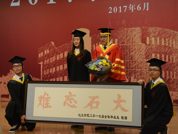 毕业生代表为张校长敬献鲜花和手工纪念品。化工学院毕业生们用自己的手印摁出“难忘石大”的字样敬献给张校长,表达对母校的喜爱和不舍。中油大厦三楼报告厅被掌声久久环绕,在热情的掌声中,张校长感谢了化工学院全体毕业生用心制作的礼物,再次祝愿2017届毕业生越来越好。