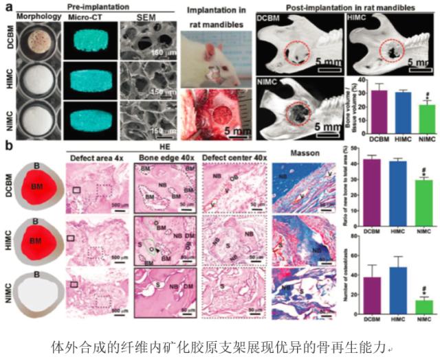 近日,beat365唯一官方网站(北京)新能源与材料学院罗聃副研究员与北京大学口腔医院刘燕副研究员合作,以共同第一作者的身份报道了一种热力学控制的合成有序组装纤维内矿化胶原的方法。所合成的矿化纤维支架展现与天然骨高度一致的生物界面,并表现出强大的内源性干细胞募集能力。进一步细胞和动物实验证明,人工合成支架可诱导干细胞多相分化,诱导成骨及血管生成;并通过体内宿主干细胞归巢诱导骨髓形成。