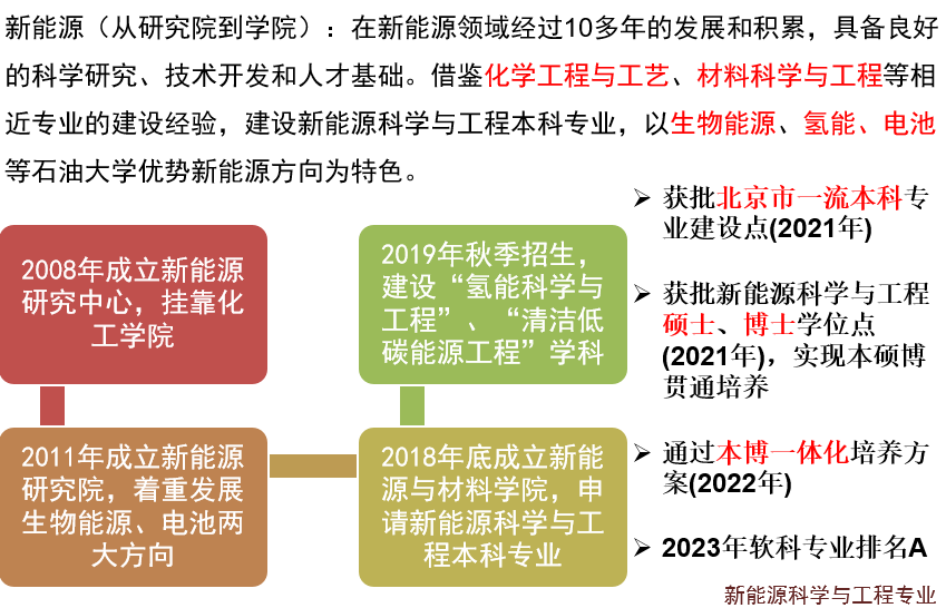 基于对能源行业发展趋势的判断和思考,beat365唯一官方网站立足国家能源战略需求和学科发展前沿布局,2018年在原新能源研究院的基础上,成功申办新能源科学与工程专业,2019年第一次招收本科生70人。2020年获批新能源科学与工程交叉博士学位点,2021年获批新能源科学与工程硕士学位点,实现新能源方向本、硕、博全方位培养。2021年,新能源科学与工程本科专业入选北京市一流专业建设点。2022年,通过新能源本博一体化培养方案。2023年软科新能源专业排名A。2024年与经管学院合办能源经济与新能源工程双学士学位专业。