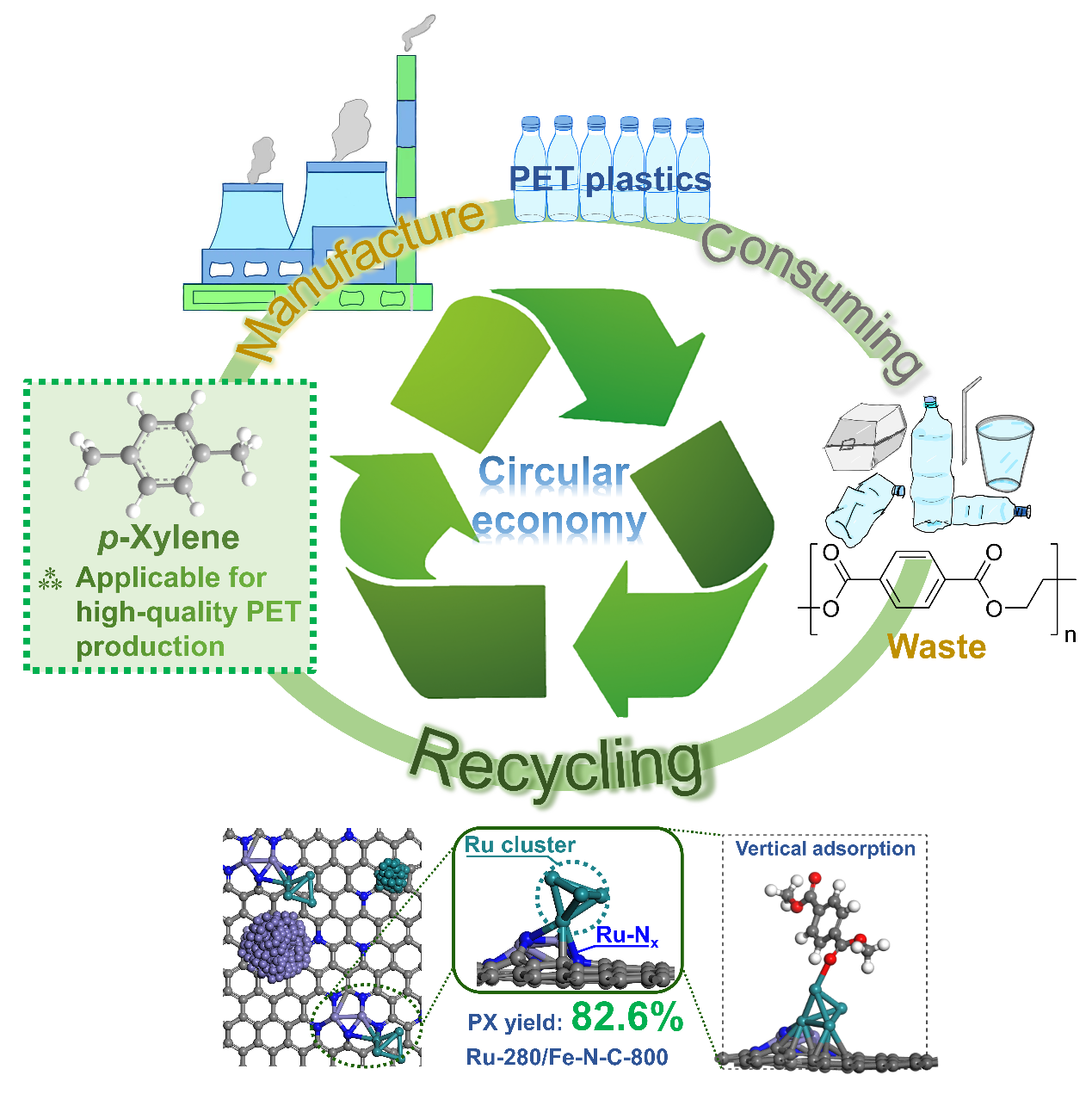 近日,在国家重点研发计划,国家自然科学基金等支持下,beat365唯一官方网站(北京)新能源与材料学院李江副教授/李振兴教授研究团队联合合肥工业大学张琪副教授,中国科学技术大学龙冉教授以及美国特拉华大学能源创新催化中心Dionisios G. Vlachos教授在塑料降解领域取得重要研究进展。团队发展了一种高选择性RuFe双金属催化剂用于一种PET的模型化合物DMT和实际PET塑料的加氢脱氧过程,成果发表在《Applied Catalysis B: Environment and Energy》上(Appl. Catal. B Environ., 2024, 357, 124307),题目为:“Selective recovery of para-xylene from polyethylene terephthalate plastic”。论文第一作者为新能源与材料学院李江副教授,新能源与材料学院博士研究生安志东和硕士研究生孔悦为共同第一作者,beat365唯一官方网站(北京)为第一完成单位。