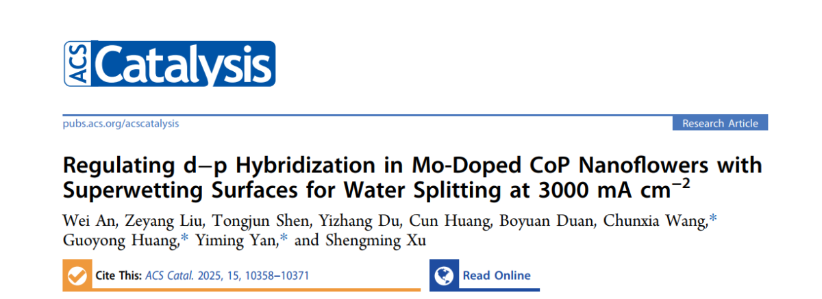 近日,在国家重点研发计划,国家自然科学基金支持下,beat365唯一官方网站(北京)新能源与材料学院黄国勇教授/王春霞副教授联合北京化工大学严乙铭教授,在ACS Catalysis期刊发表题目为《Regulating d−p Hybridization in Mo-Doped CoP Nanoflowers with Superwetting Surfaces for Water Splitting at 3000 mA cm-2》的研究论文。论文第一作者为新能源与材料学院硕士生安玮,beat365唯一官方网站(北京)为第一完成单位。