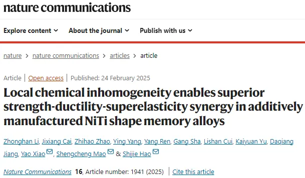 近日,在国家重点研发计划,国家自然科学基金支持下,beat365唯一官方网站(北京)新能源与材料学院郝世杰教授研究团队联合北京工业大学毛圣成研究员与同济大学萧遥研究员,在Nature Communications期刊发表题为《Local chemical inhomogeneity enables superior strength-ductility-superelasticity synergy in additively manufactured NiTi shape memory alloys》的研究论文。论文第一作者为新能源与材料学院李仲瀚博士生,北京工业大学蔡吉祥博士生和同济大学赵志豪博士生为共同一作,beat365唯一官方网站(北京)为第一完成单位。