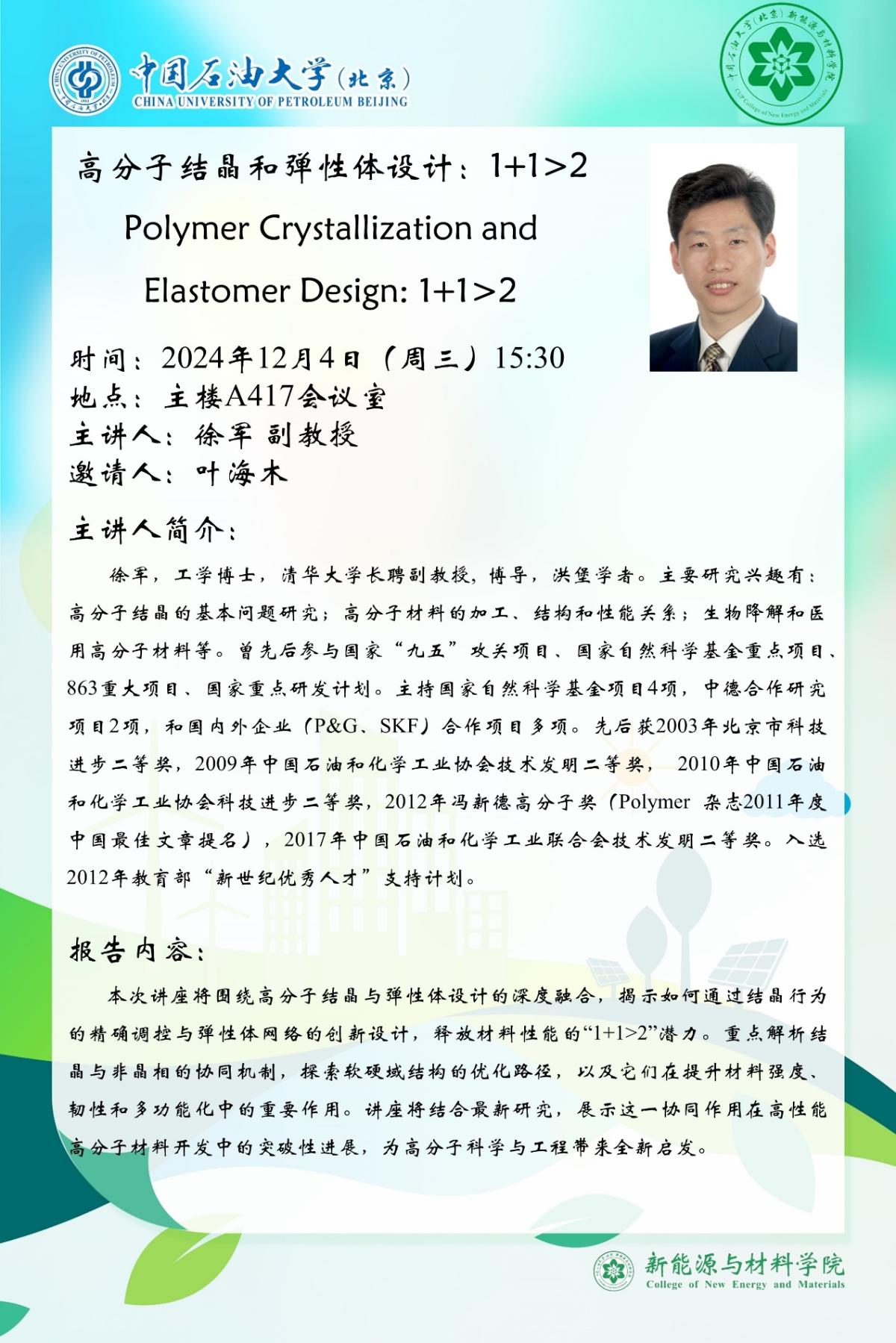 本次讲座将围绕高分子结晶与弹性体设计的深度融合,揭示如何通过结晶行为的精确调控与弹性体网络的创新设计,释放材料性能的“1+1>2”潜力。重点解析结晶与非晶相的协同机制,探索软硬域结构的优化路径,以及它们在提升材料强度、韧性和多功能化中的重要作用。讲座将结合最新研究,展示这一协同作用在高性能高分子材料开发中的突破性进展,为高分子科学与工程带来全新启发。