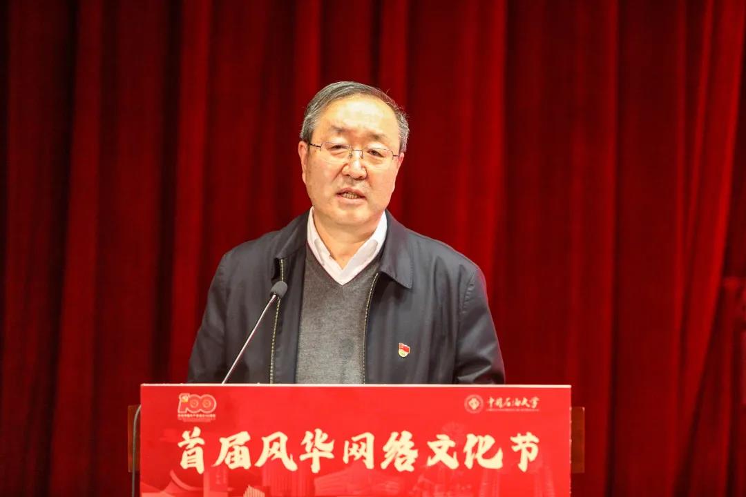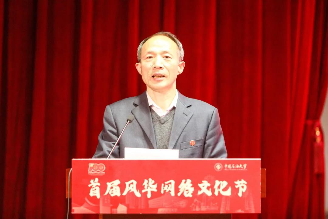鲍志东在致辞中介绍了首届风华网络文化节的开展情况。为庆祝中国共产党成立100周年,深入贯彻落实习近平总书记给克拉玛依校区毕业生重要回信精神,推进党史学习教育走深走实,厚植师生家国情怀,进一步创新网络思想政治教育,加强校园文化建设,今年1月中旬,学校启动了首届风华网络文化节,面向师生广泛征集原创网络文化作品和网络教育优秀作品。近千名师生提交了专题策划、视频、工作案例、平面设计、网络文章等各类作品400余件(组)。最终评选出优秀策划奖3项、优秀案例奖1项、优秀视频奖7项、优秀平面设计奖6项、优秀文字作品奖9项。