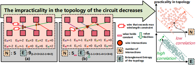 我们展示了定义的纠缠熵可有效的用于电路拓扑的初始化过程。图1展示了三个不同的电路拓扑示例,可以观察到随着拓扑结构中交点个数(N)的减少,电路的布局效果逐渐提高。同时,我们还展示了纠缠熵这一指标与交点的数量紧密相关,且利用纠缠熵(E)的变化来优化初始布局要好于直接使用交点个数(如图2所示)。