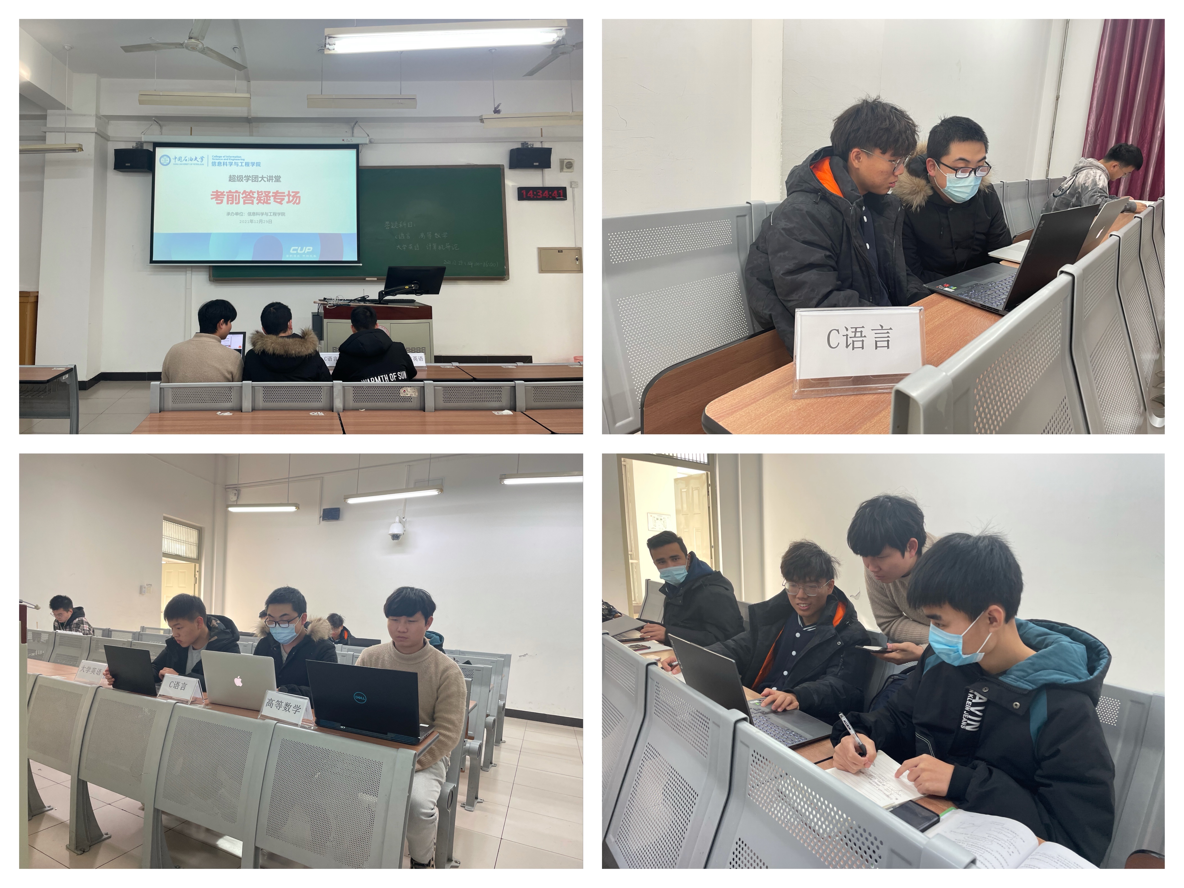 2021级优秀研究生张宏伟、黄超和袁明才为大一同学进行线下科目答疑,通过典型练习题讲解,重要知识点梳理,为学生指明备考方向。