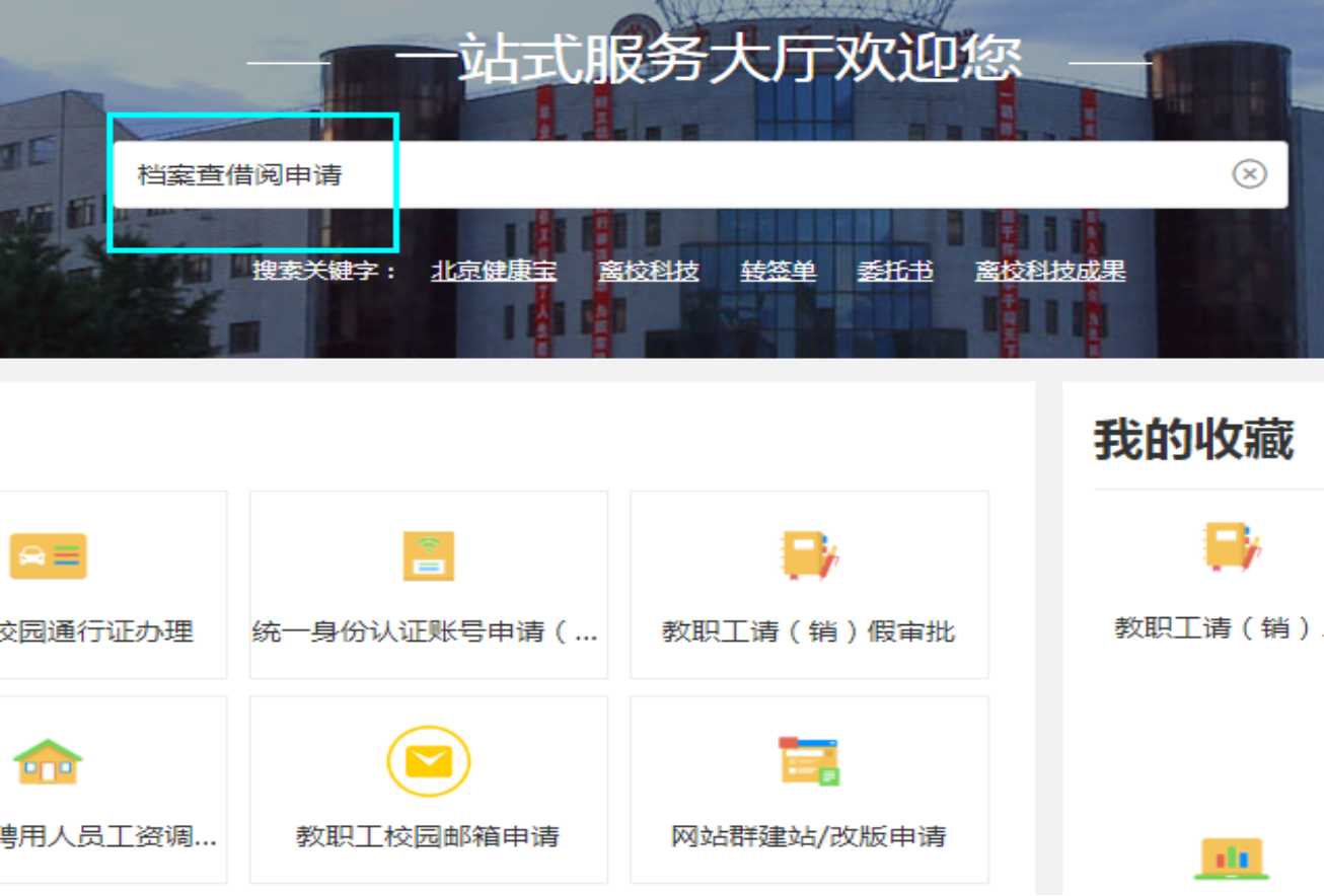 1.申请人登录e服务(https://eserv.cup.edu.cn/),检索“档案查借阅申请”或关键词“档案”,点击进入“档案查借阅申请”服务。