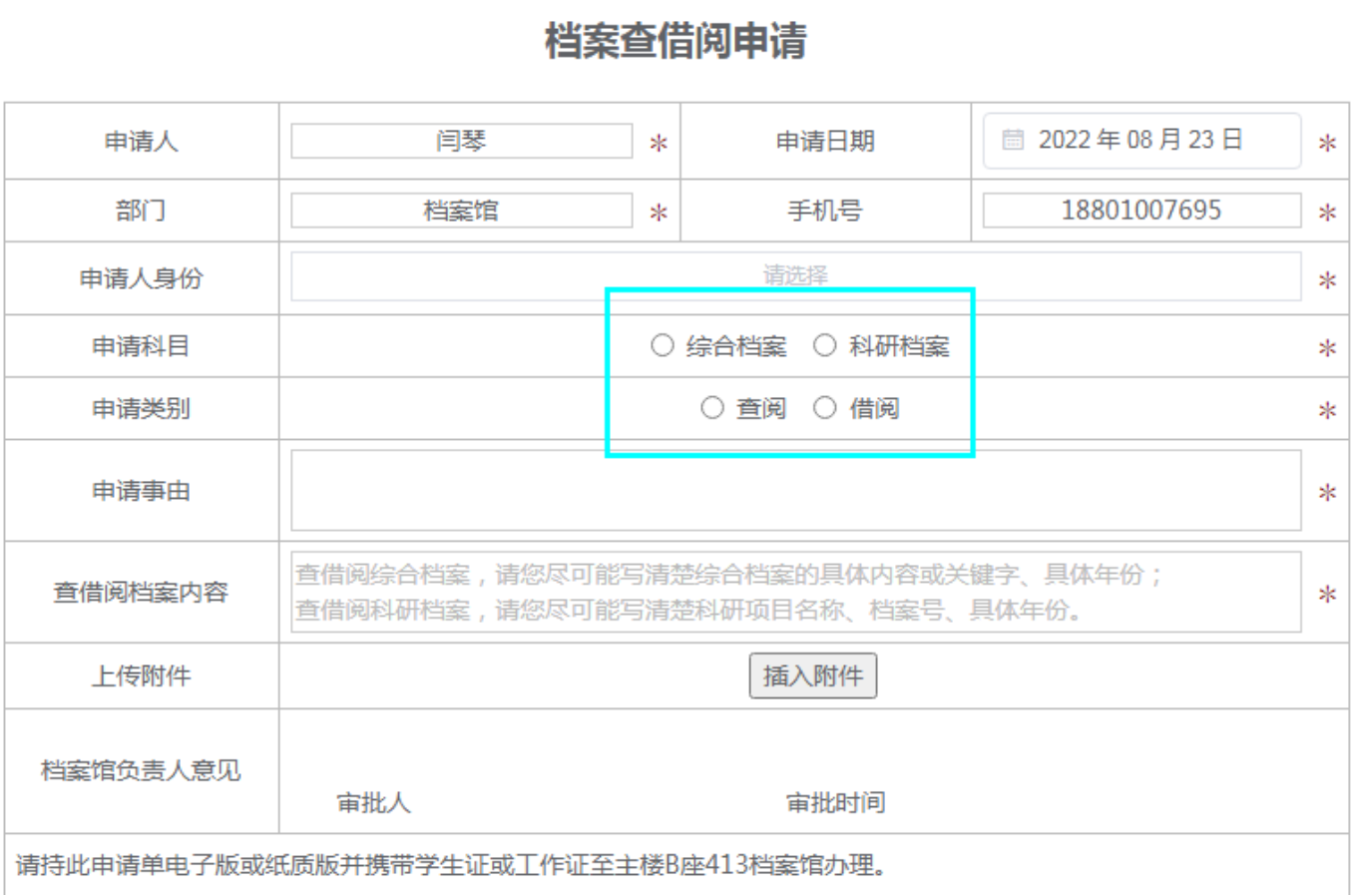 3.档案查借阅申请科目分为“综合档案”和“科研档案”,申请类别分为“查阅”和“借阅”,请按照需求选择申请科目和类别,填写申请人身份、申请事由、查借阅档案内容,点击“正式提交”,流程转至申请单位负责人/申请项目负责人审批。