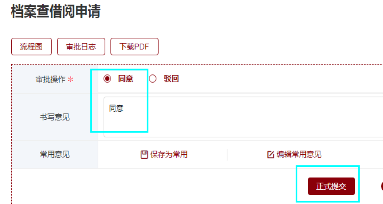4.申请单位负责人/申请项目负责人填写审批意见,点击“正式提交”,流程转至档案馆负责人审批。