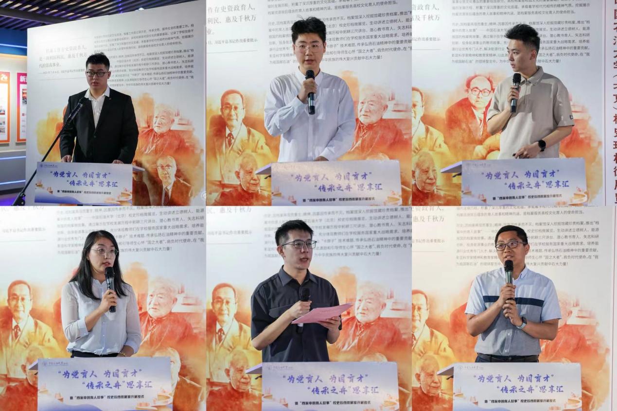 青年教师和学生代表讲述了六位“大先生”的育人故事。地球科学学院范泽远、石油工程学院夏晟博、化学工程与环境学院朱金铸作为学生代表讲述了“大先生”们在躬身学校科教工作中彰显的科学家精神和教育家精神,分享了自己在育人故事中汲取的精神激励以及笃志专业学习、胸怀能源报国的决心。地球科学学院孙晶、石油工程学院贺垠博、化学工程与环境学院闫子涵作为青年教师代表分享了自己在教学生涯中的心路历程、在师德传承中实现自我价值的心得,以及要在涵养深厚家国情怀、褒有优秀师德师风、锤炼过硬教师素养中传承弘扬科学家精神、教育家精神的志向。