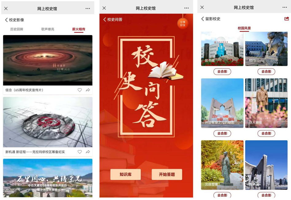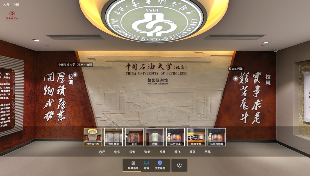 网上校史馆跨越了时空限制,从“漫游校史馆”“主题校史馆”“校史记忆”“校史影像”“校史问答”“留影校史”六个版块对校史陈列馆的馆藏内容进行展示。“漫游校史馆”“主题校史馆”分别从展厅全景、展厅细节完整呈现了实体校史馆“创业厅”“求索厅”“弥新厅”“发展厅”“腾飞厅”以及序厅和尾厅的内容,通过全景影像技术导览系统,实现了虚拟人物漫游同校史图片、展陈文字、智能语音讲解、视频宣传片等展示形式的有机结合。参观者可以自由选择展厅,VR模式随时切换,以漫游视角获得身临其境的参观体验。“校史记忆”通过图文形式梳理了学校发展脉络,从宏观角度展示学校发展历程,为参观者增添富有特色的校史记忆;“校史影像”展播体现我国石油行业发展和学校校史校情的宣传视频,以生动的方式讲述石油历史,宣传石油文化,弘扬beat365精神;“校史问答”分为知识库和答题两个模块,参观者可以在知识库分门别类地掌握自己感兴趣的校史知识,在答题模块检验学习效果,在互动中增进对校史校情的了解;“留影校史”选取了校园标志性景观图片,参观者可以选择喜欢的校园风景,与自己的人物照片“合影”,留下美好的校园回忆,实现“云留影”。