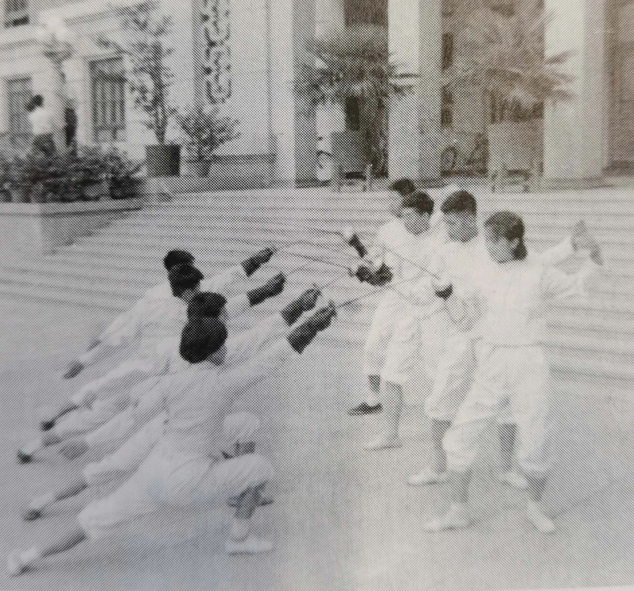 1960年北京北郊高校击剑冠军赛胡世军(左一)获女子花剑冠军,高淑玫(右一)获亚军