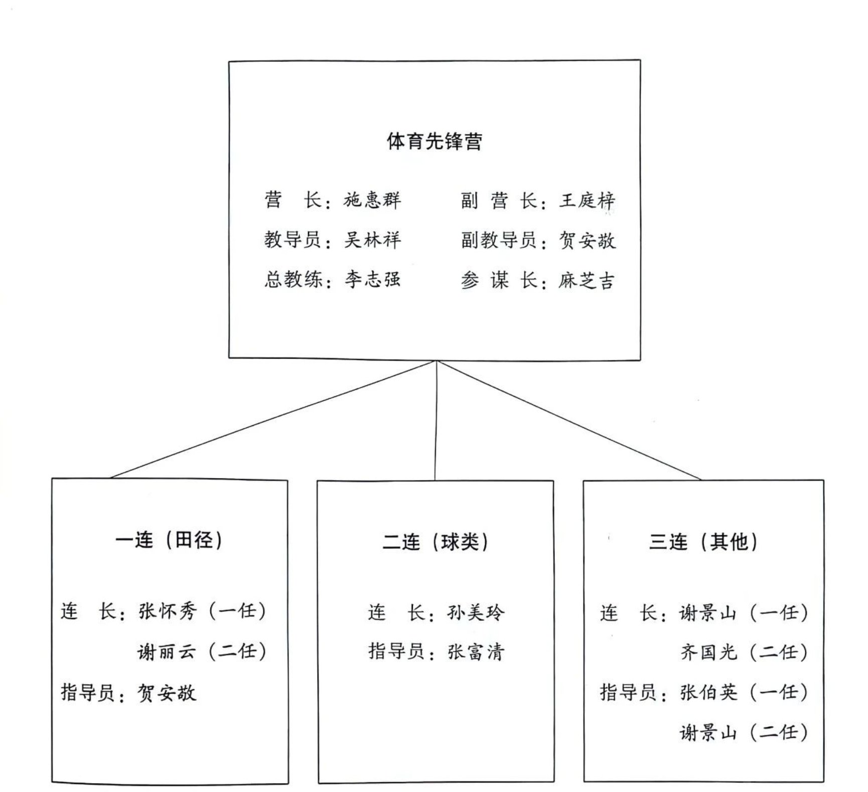 体育先锋营实行统一领导,集中管理,建立党团组织,随班上课的方式。下设三个连,一连为田径队,二连为球类队,三连为其他各项代表队。体育老师结合自己的专长,相应地担任了各代表队的教练。学校任命李志强为总教练,同时选调了10名干部充实体育各级机构,以加强思想工作和组织管理。