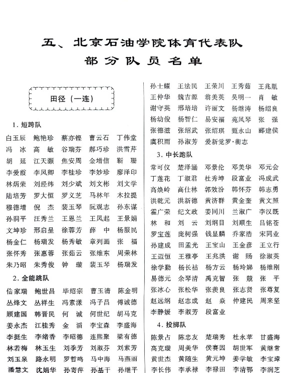1959年5月,在北京石油学院红旗操场举行的第五届首都高校学生田径运动会上,女子获团体总分第二名(82.5分),男子获团体总分第四名(82.5分),男女团体总分列第三名(165分),成为了高校田径方面异军突起的一支劲旅。