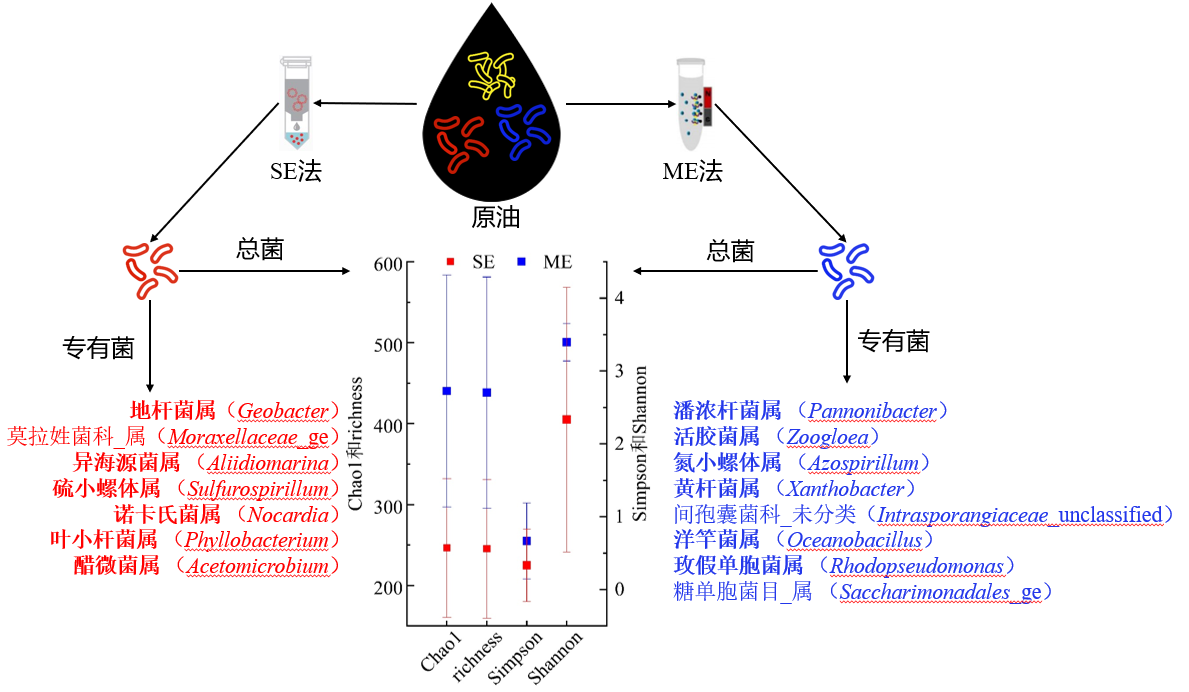 部分成果以论文《柱式法和磁珠法提取原油脱氧核糖核酸》在领域专业高水平期刊《beat365唯一官方网站学报(自然科学版)》上发表(知网首发:2024年11月28日,https://zkjournal.upc.edu.cn/zgsydxxben/article/html/20250424)。目前核酸提取方法的分类主要分为柱式法(spincolumn based extraction method,SE)和磁珠法(magnetisable solid phase extraction method,ME),两类方法是核酸提取最为常用的两类纯化方法,已有少数关于两类方法在非油藏样本上效果比较的报道,褒贬不一,迄今尚未有相关报道评价它们对原油样本的适用性。本文首次在油藏微生物领域比较了SE和ME直接对原油微生物DNA提取的适用性,对长庆油田同一批采集12个原油样本使用SE和ME两种方法提取核酸并进行了质量检测及菌群结构和多样性分析,结果表明,两方法对部分微生物存在专有的响应性,SE提取质量浓度更高并对油藏微生物有更好响应,ME灵敏度更高、稳定性更强并对总微生物群落结构和多样性有更好的响应,进一步揭示了这两类核酸提取方法的应用前景。论文得到了匿名评审专家的肯定评价,“论文的结构和层次清楚合理”、“作为第一篇比较文章,为未来的工作有良好的指导意义”。本团队的相关工作也可见论文《Rapid Accuracy determining DNA purity and concentration in heavy oils by spectrophotometry methods》(Petroleum Science,https://www.sciencedirect.com/science/article/pii/S1995822623001863 ;/dwzx/xwdt/cg/0e328026d71744fdad4a48151ee44b47.htm)、《基于自主核酸提取方法分析单油井采出液微生物》(油气田环境保护,https://yqtb.cbpt.cnki.net/portal/journal/portal/client/paper/0c3608622f40f37eaf36bd0226e34384 ;