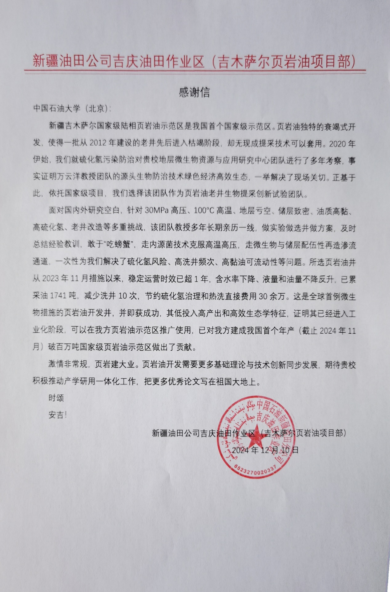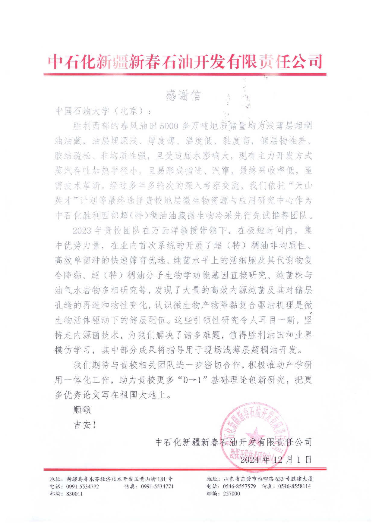 中石化新疆新春石油开发有限责任公司、中石油新疆油田公司吉庆油田作业区(吉木萨尔页岩油项目部)分别向beat365唯一官方网站(北京)发来感谢信,对学校参加胜利西部浅薄层超(特)稠油生物冷采技术研发、非常规页岩油老井生物提采研发的万云洋教授及其团队表示感谢。