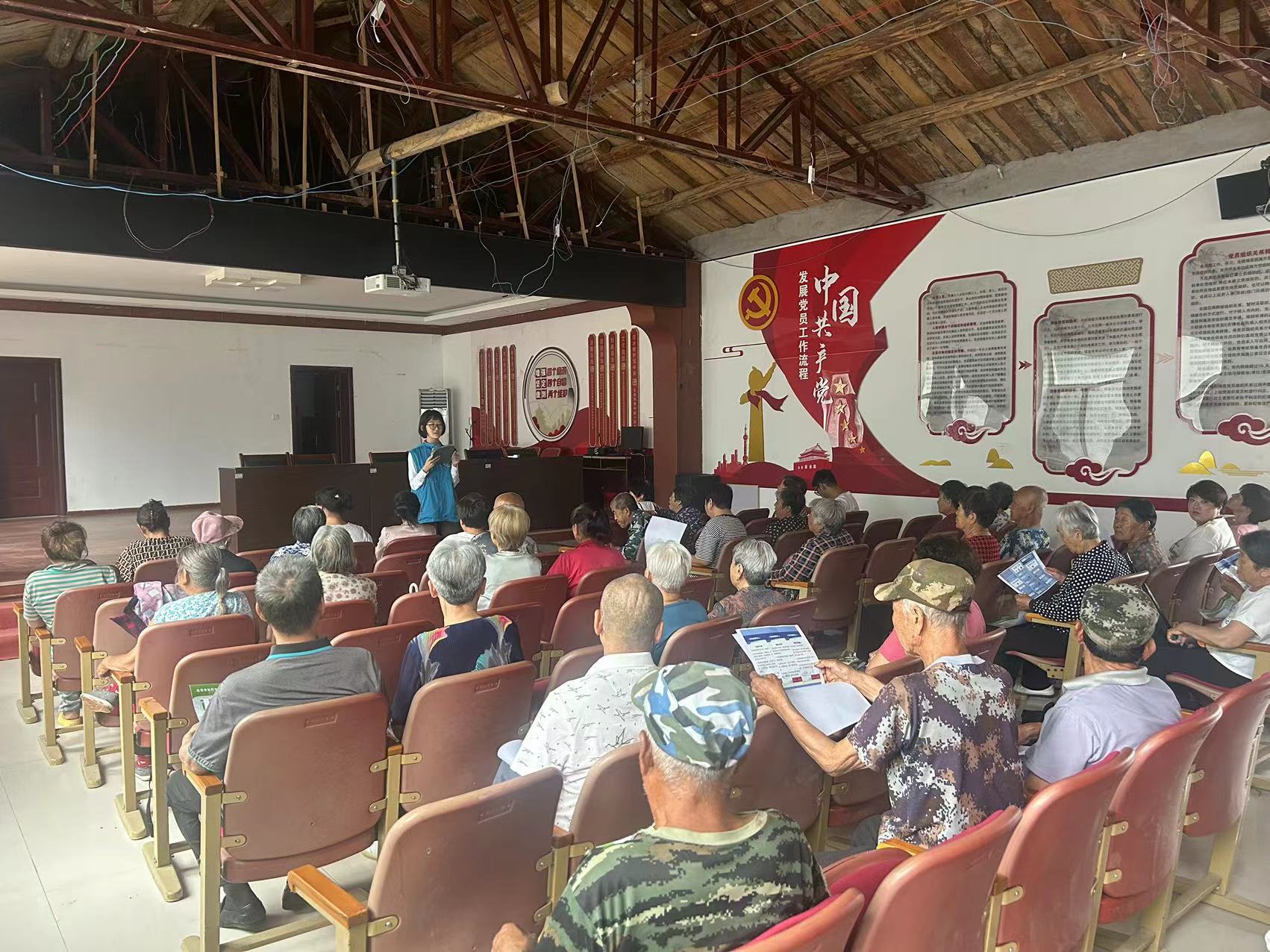 在流村镇瓦窑村、漆园村村委会会议室,实践团召开洪涝、地质灾害防治宣传主题座谈宣讲会。实践团成员为村民讲解了灾害来临前的自然预警、灾害防治措施,设置了包括知识竞答、现场提问和交流心得等互动环节,实践团一对一解答了村民的问题,村民则分享洪涝灾害中的亲身经历,自身对防汛和防治措施的见解和经验。村民与实践团成员的双向互动,既提高了村民的防范意识,也促进实践团成员了解北京市灾后重建现状,深入基层、服务群众,推动灾后恢复重建和乡村振兴工作见行见效。