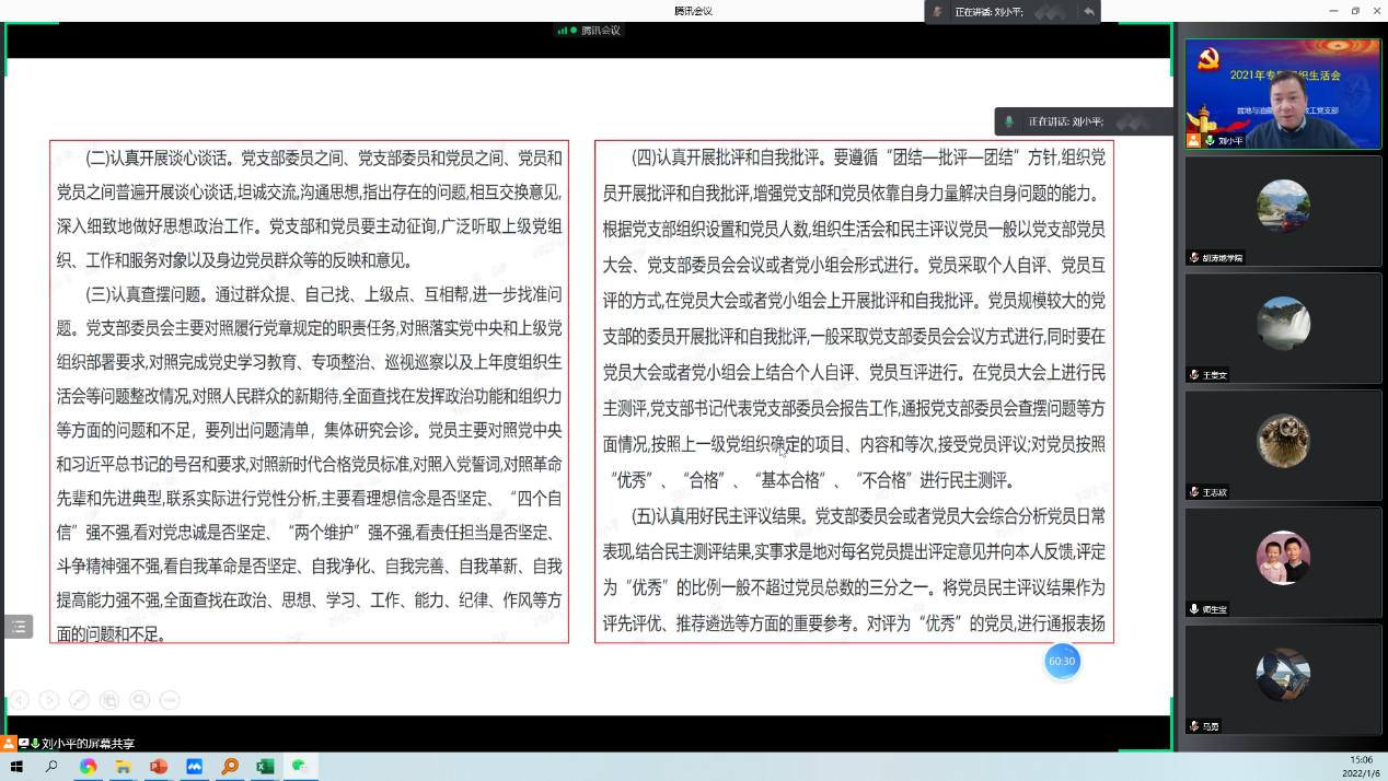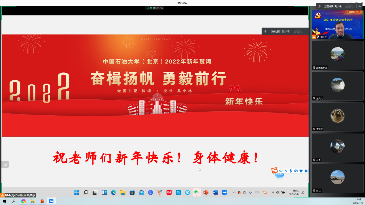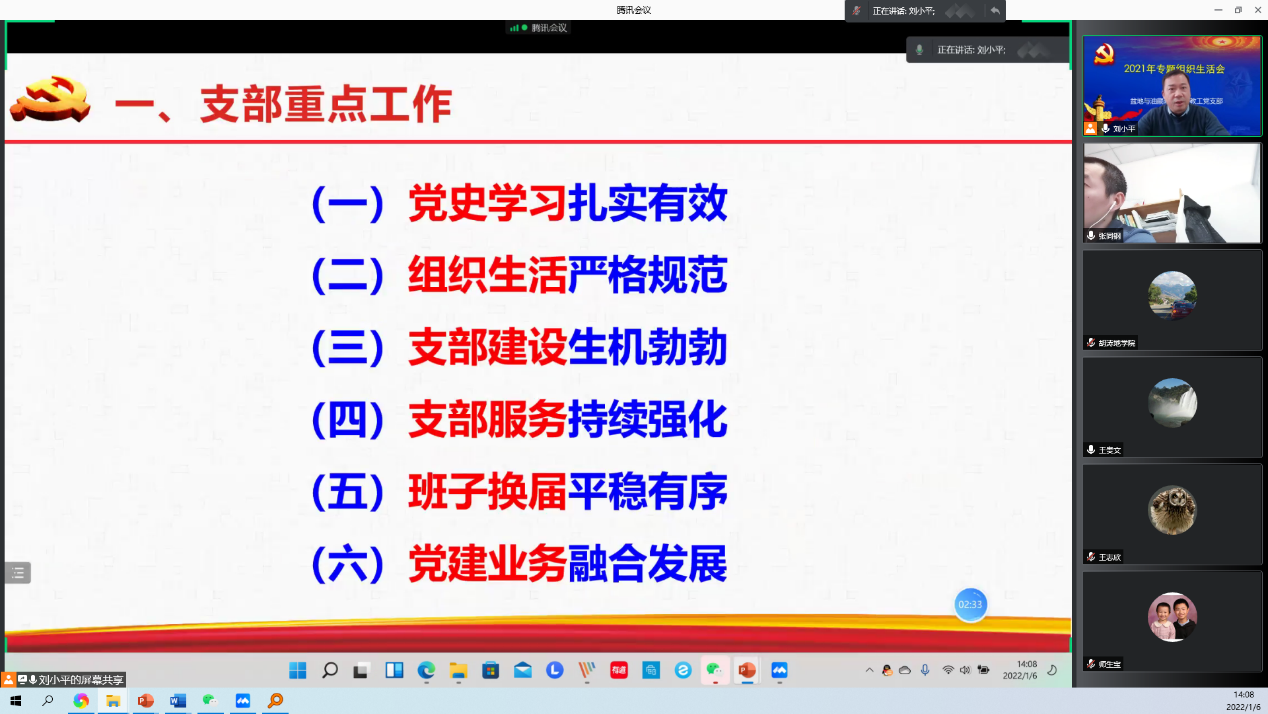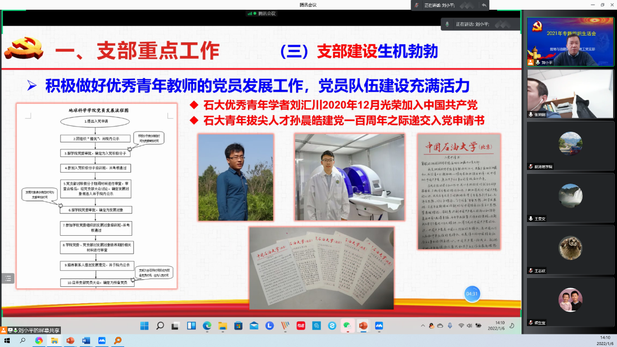 2022年1月6日下午,盆地与油藏研究中心教工党支部组织全体教职工线上进行了“2021年专题组织生活会”,共有32位党员和教职工参加了本次组织生活会,会议由刘小平同志主持,学院党委书记王贵文同志、学院副院长刘钰铭同志参加了会议,会议分为四个阶段。