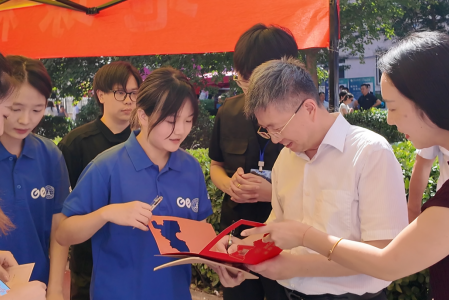 在温馨的交流现场,有两位特别的新生,她们在报到后便主动申请加入迎新的志愿者队伍,充分展现了地学院学子的青春担当。这两位新生热情洋溢地拿出录取通知书,真诚的邀请金校长签名勉励,并落落大方地进行了自我介绍: