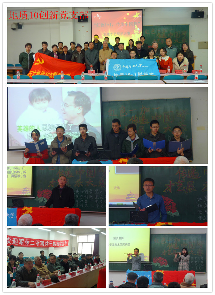 昌平军休二所是地学院“红色1+1”共建支部,为稳固共建成果、传承红色文化,地质10创新党支部与地质10-7团支部联合策划承办了“红色1+1,传承中国梦”主题联欢会。会上,支部党员、团员积极分子们分别以演讲、诗歌朗诵、红歌、陶笛演奏等形式进行了才艺展示。每项表演结束后,每位老干部都会对节目进行了点评和打分,对表演优秀的同学进行奖励。期间,老干部洪征同志还给同学们讲述了自己参加抗美援朝的经历,赢得了同学们的阵阵掌声。干休二所李所长对本次活动进行了总结并给予了高度评价。