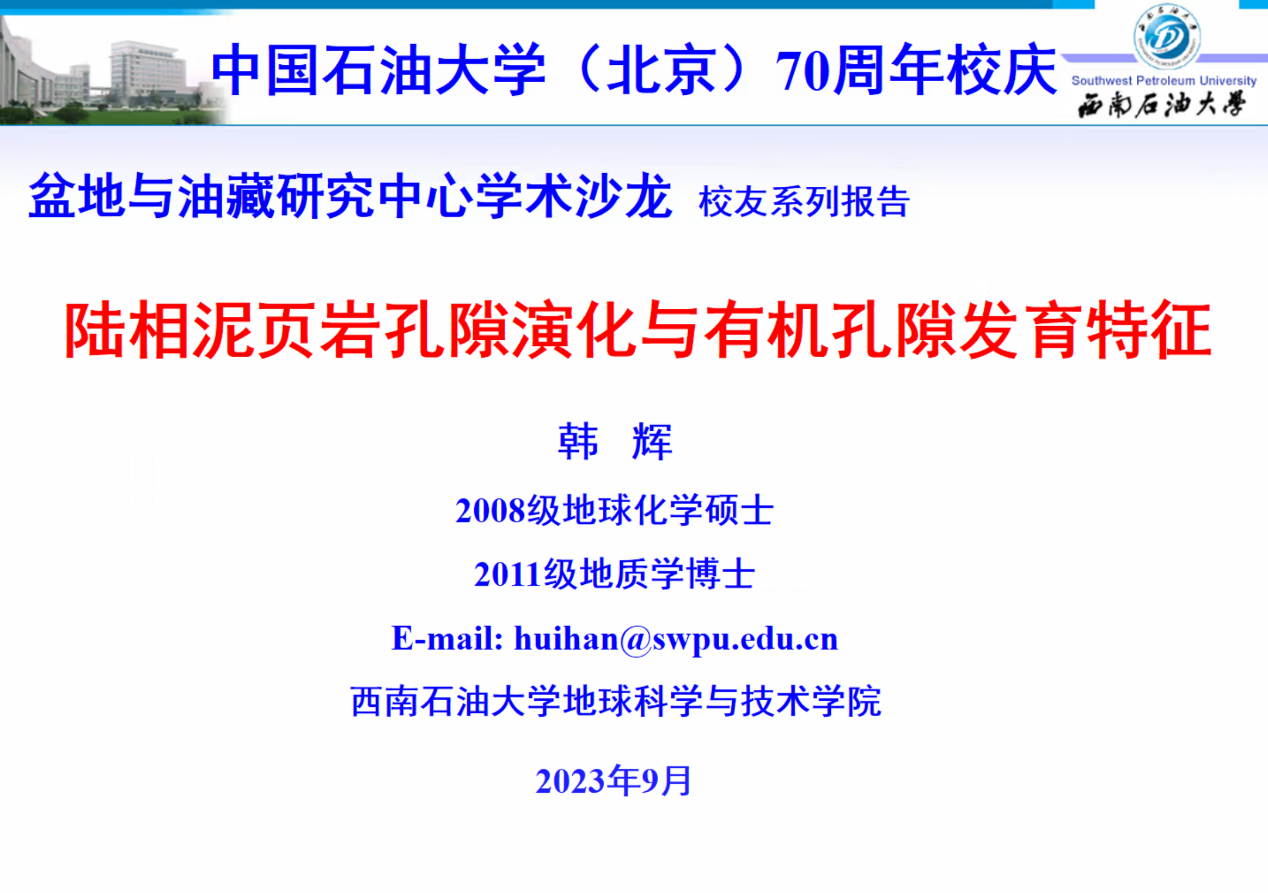 韩辉教授开展了题为“陆相泥页岩孔隙演化与有机孔隙发育特征”的学术报告,针对页岩有机质孔隙的非均质性和演化展开了深入研究。他从陆相页岩孔隙的演化、有机孔隙的定量评价、有机孔隙与显微组分的关系以及有机孔隙发育的影响等多个方面进行了学术交流,揭示了页岩有机质孔隙形成与保存的机制,并探讨了控制有机质孔隙连通性的因素。这些发现对于更好地理解页岩储层、优化资源开发和提高采收率具有重要的学术和应用价值。