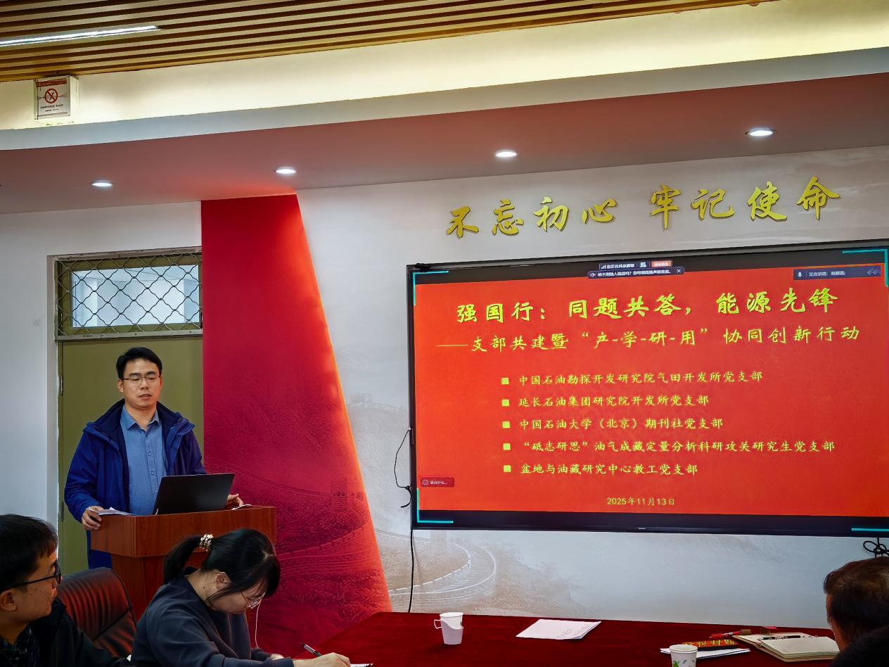 2025年11月13日,地球科学学院盆地与油藏研究中心教工党支部联合中国石油勘探开发研究院气田开发所党支部、延长石油集团研究院开发所党支部、学校期刊社党支部、“砥砺研思”油气成藏定量分析科研攻关研究生党支部,在地质楼1101会议室共同举办“强国行:同题共答,能源先锋——支部共建暨‘产-学-研-用’协同创新行动”组织生活。地学院党委书记刘钰铭、副院长罗情勇及各共建单位党支部代表出席会议。