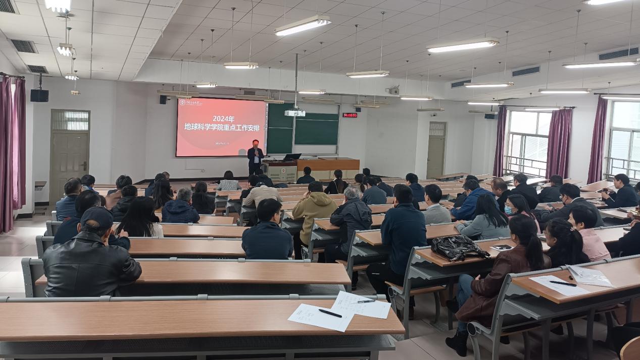 地球科学学院院长王贵文首先介绍了学校重点工作部署情况。接下来从本科教育教学、研究生教育教学、科研及人才工作、学生工作、党建工作、工会工作、学科建设工作等几个方面对学院2024年的工作进行了部署。