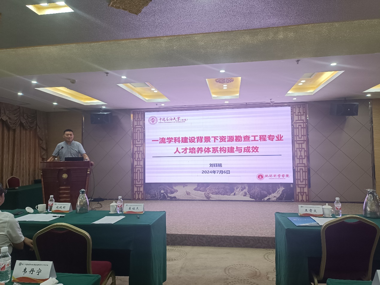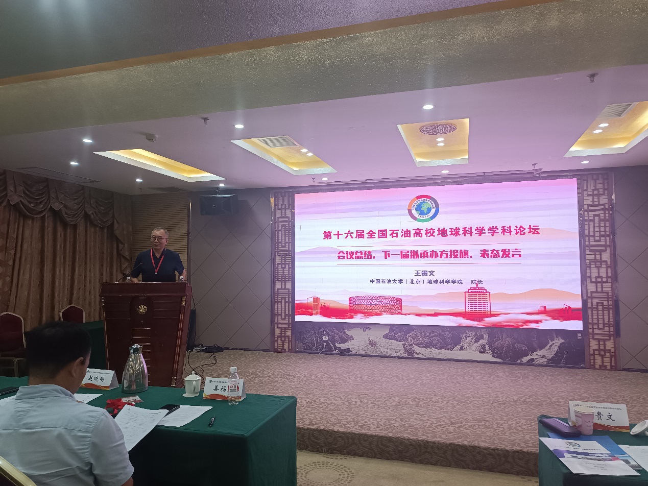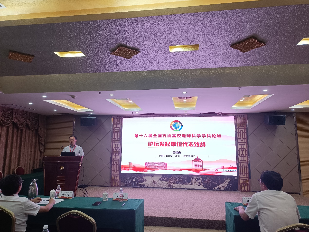 地球科学学院书记姜福杰应邀作了论坛发起单位代表致辞;副院长刘钰铭和牛花朋分别作了题为《一流学科建设背景下资源勘查工程专业人才培养体系构建与成效》和《产教融合打造高质量专业学位研究生课程体系》的专题报告;院长王贵文进行了会议总结,同时宣布下一届会议由西南石油大学承办并进行了授旗仪式。