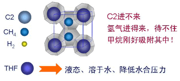 提出降低水合压力和提高分离效果的原创方法(发明专利ZL00100279.1;ZL02129611.1):相平衡研究发现:要获得高纯度的氢气需要很高的水合压力(大于30MPa),CH4和C2一起生成水合物时表现出一定程度的共生效应,甲烷占据水合物的小孔、C2占据大孔,水合分离效果远比预想的差。为解决这些瓶颈问题,基于本项目提出的“拟化学反应+吸附”双过程机理,采用一种很容易生成水合物的化学物质(如四氢呋喃)先生成基础水合物,再用基础水合物丰富的笼孔来吸收甲烷等小分子气体,从而显著降低了含氢气体混合物的水合压力。只需要4 MPa的压力就可将氢气提浓到95%以上。还是基于该机理,通过在水溶液中加入较高浓度的四氢呋喃,使其在形成基础水合物时占据全部大孔,只留下小孔来吸附甲烷等小分子气体,使乙烷、乙烯等直径较大的分子既没有机会进入大孔,又不能进入小孔,这样就显著提高了CH4和C2的水合分离效率。