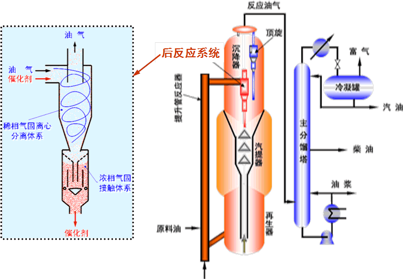 催化裂化后反应系统由提升管反应器出口到离开沉降器所涉及的一系列装备构成(图1),其主要功能是抑制油气二次反应和回收催化剂,以获得理想的产品分布和实现装置的长周期运行,核心装备是提升管出口快分系统。高效快分系统开发的难点和关键是要求在同一设备内同时达到“三快”和“两高”的要求。“三快”是指“油剂的快速脱离”、“分离催化剂的快速预汽提”和“分离油气的快速引出”,“两高”是指“催化剂的高效分离”和“高油气包容率”。以上“三快”和“两高”的要求相互制约,高度关联,因此开发难度极大。