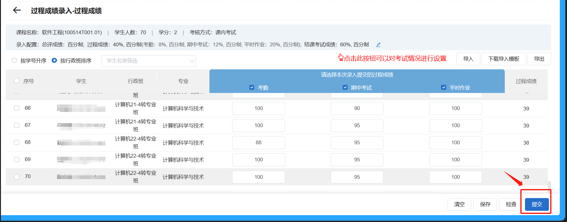 4.总评成绩录入:点击成绩比例配置页面的【开始录入】或者过程成绩提交后的【综合成绩录入】都可进入到总评成绩录入页面。