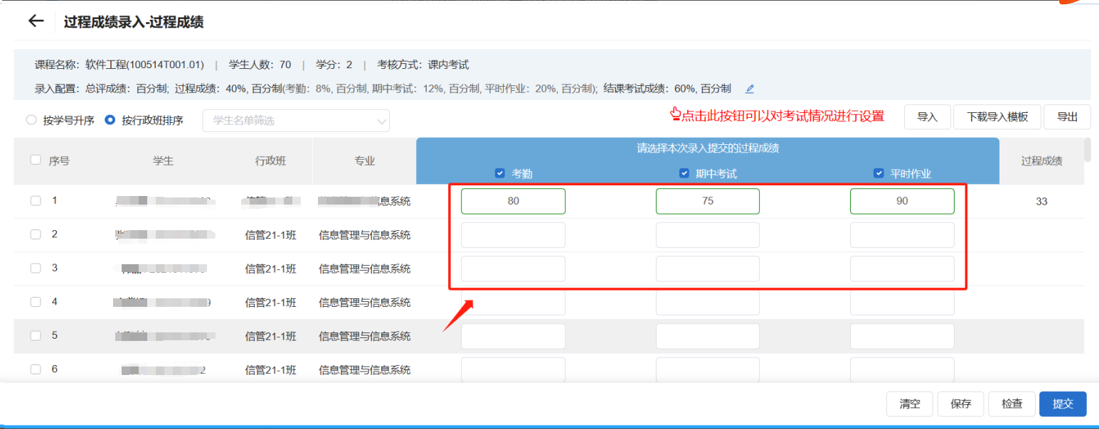 (1)手动录入:进入过程成绩录入页面,可以直接在学生后的成绩录入框录入对应的过程成绩,页面会实时保存已录入的成绩。