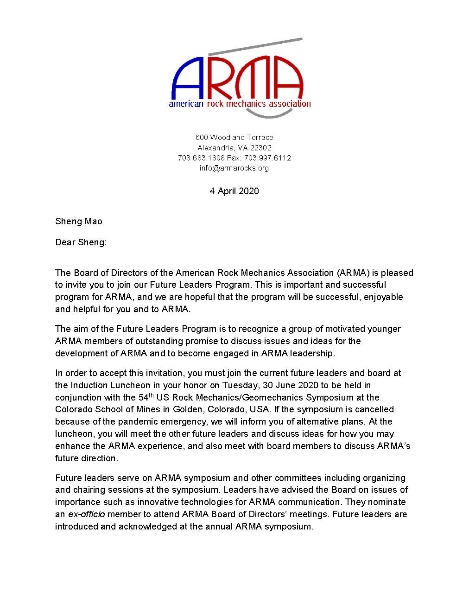 盛茂入选美国岩石力学协会“未来领军者计划”