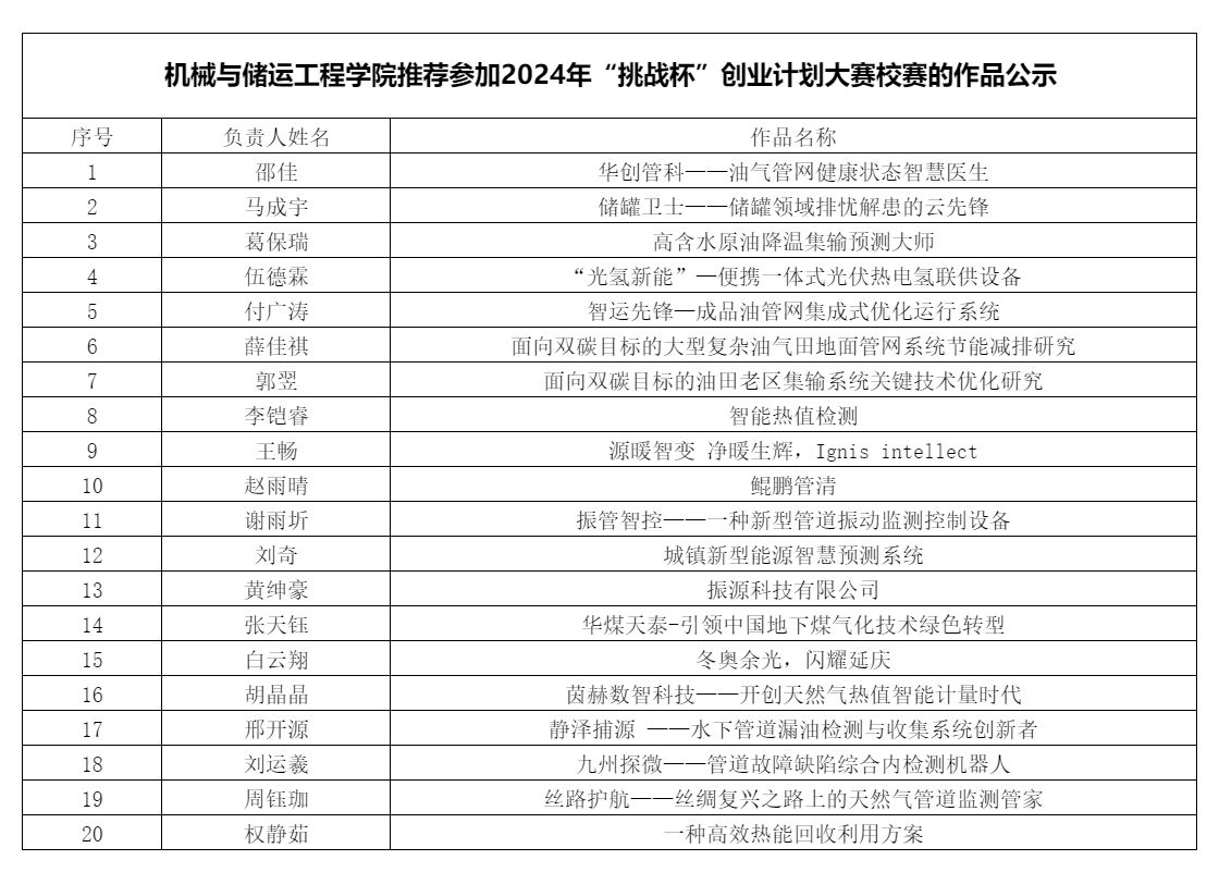 2024年1月14日,机械与储运工程学院开展对2024年“挑战杯”创业计划大赛校赛作品的选拔工作,学院共报名27只队伍,经过专家对各队PPT评审,共选拔出20只队伍参加校赛,公示名单如下: