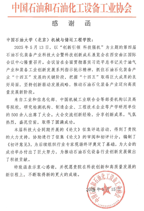 近日,中国石油和石油化工设备工业协会向我院发来专项感谢函,高度肯定我院在2025第四届石油石化装备产业科技大会暨科技创新成果展览会筹办中做出的积极贡献。作为本次大会核心学术支撑单位,我院承担了大会征集的学术论文的审阅和初评计分工作,以专业水准赢得了高度赞誉。