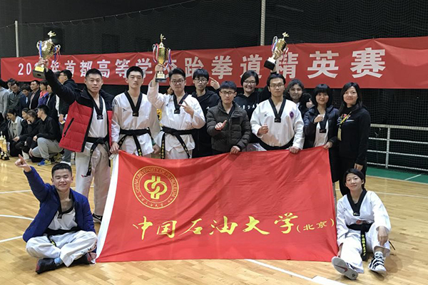 11月17日,由北京市大学生体育协会跆拳道分会主办的“2019年首都高等学校跆拳道精英赛”在北京科技大学举办。石大代表队18人参赛,荣获乙组团体总分亚军、女子团体亚军、男子团体亚军,运动员李尚赫获女子个人品势项目第一名,孙德欣、封梓超、丘祥龙获男子团体品势项目第一名,孙德欣、孔繁格获得混合品势第一名,孙德欣获得男子个人品势第二名。杨庚明等8人分获八个项目第三名,刘瑞璟等6人分获六个项目第五名,孙德欣获“优秀运动员”称号,吴素英获“优秀教练员”称号。