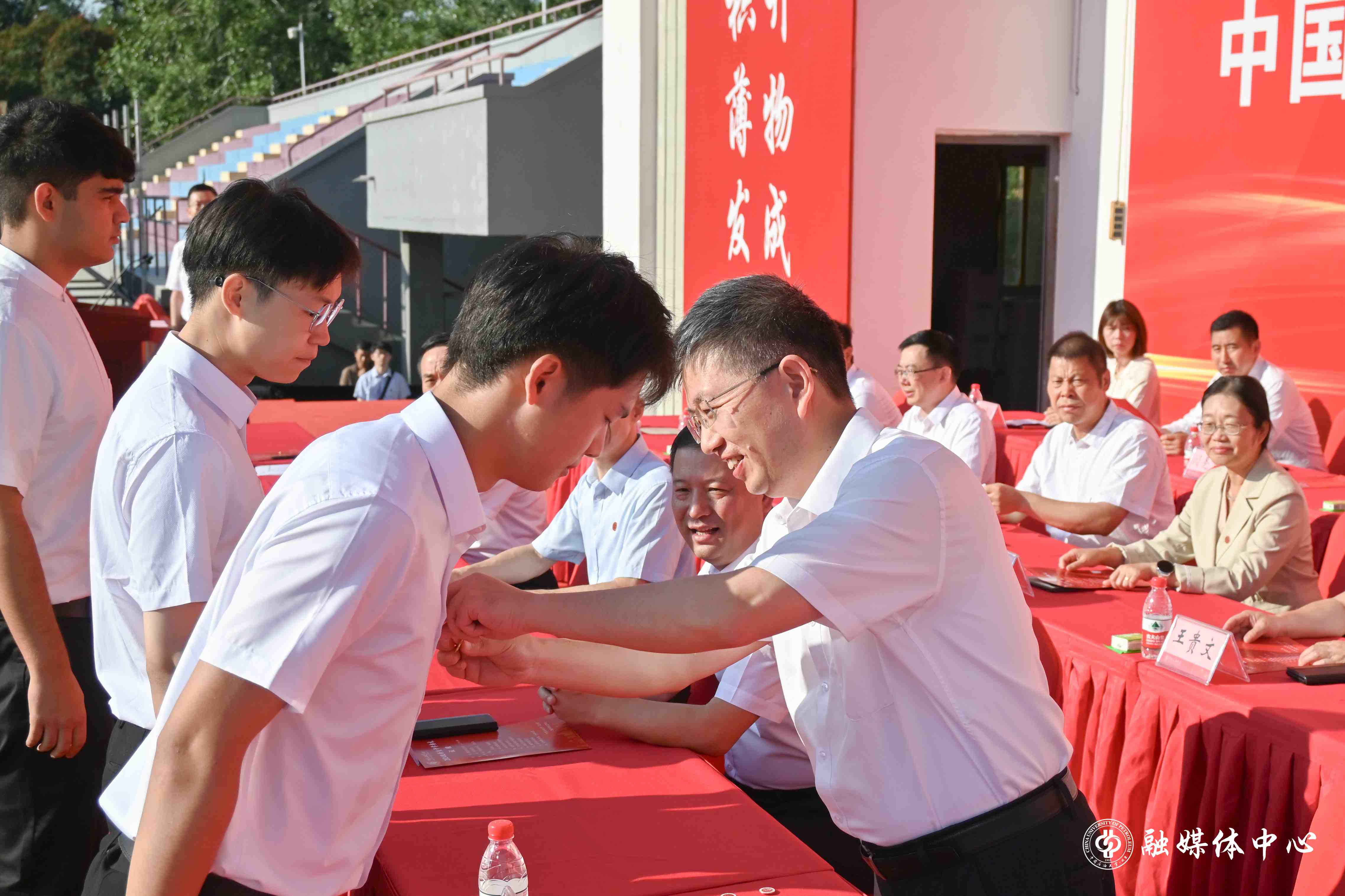 金衍为新生代表们佩戴校徽。新生胸前徽章熠熠闪耀,宣示着又一批青春力量在beat365走上奋进之路、逐梦之旅。