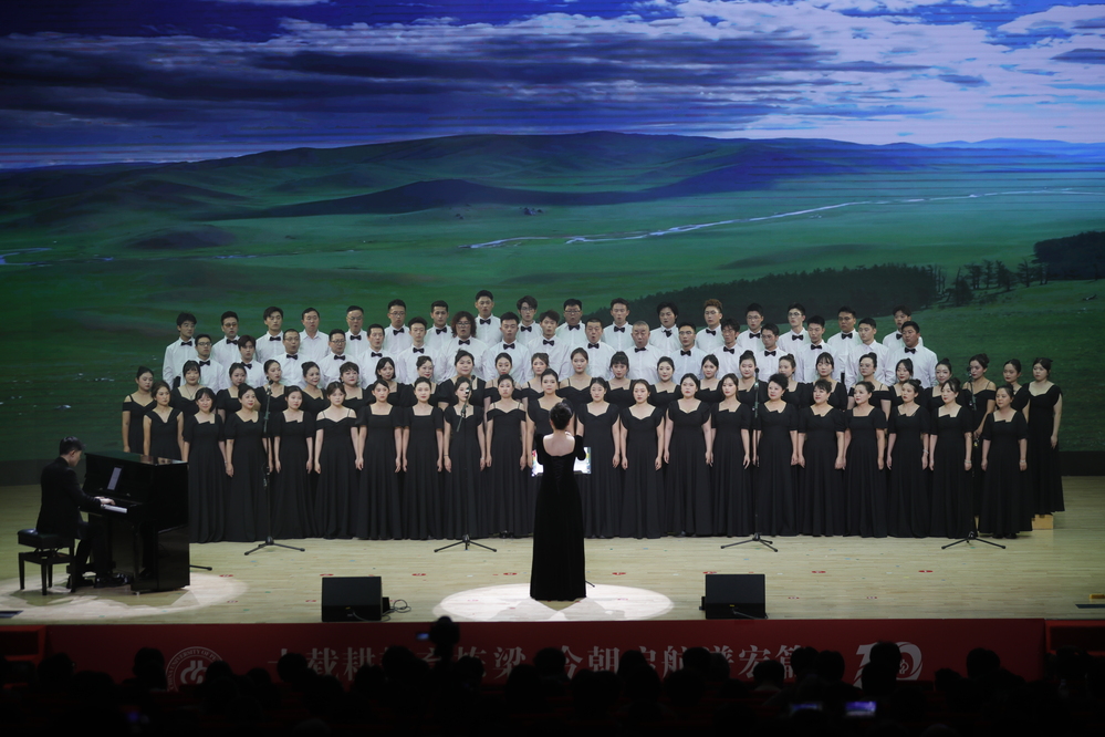 在第三篇章“向未来·赓续荣光”中,歌伴舞《一起向未来》《在希望的田野上》以动人歌声与优美舞姿,表达对美好未来的憧憬与祝福;诗歌朗诵《星火十载耀边疆》深情诉说育人初心,引发全场共鸣。晚会在合唱《欢乐的那达慕》《莫尼山》的恢弘旋律中落幕。