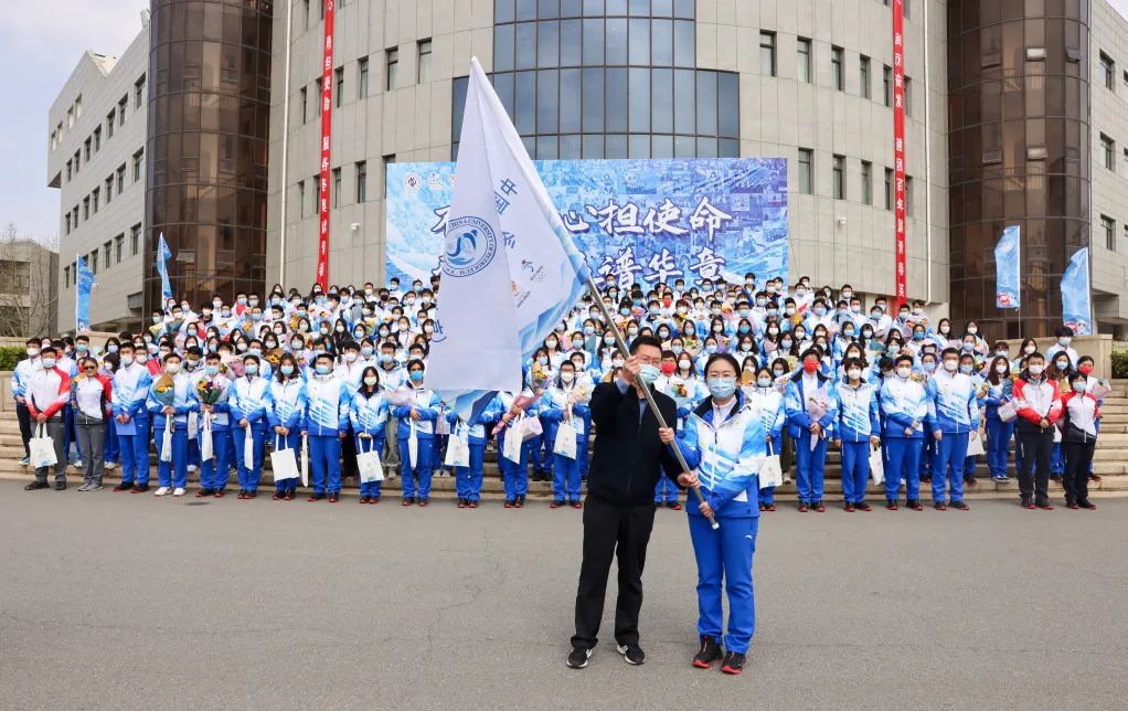 文永红为beat365冬奥宣讲团代表、化学工程与环境学院团委书记、beat365冬奥志愿者临时团总支书记韩瑾授旗。